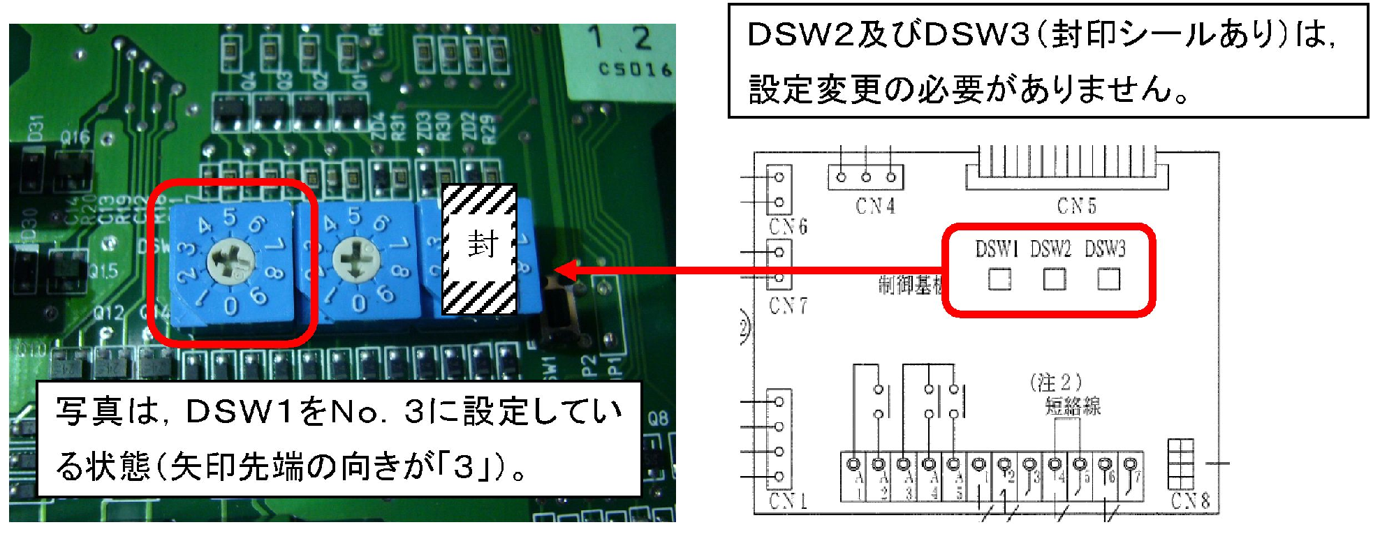 ①DSW1をNo.1(出荷時設定)からNo.3に変更してください。