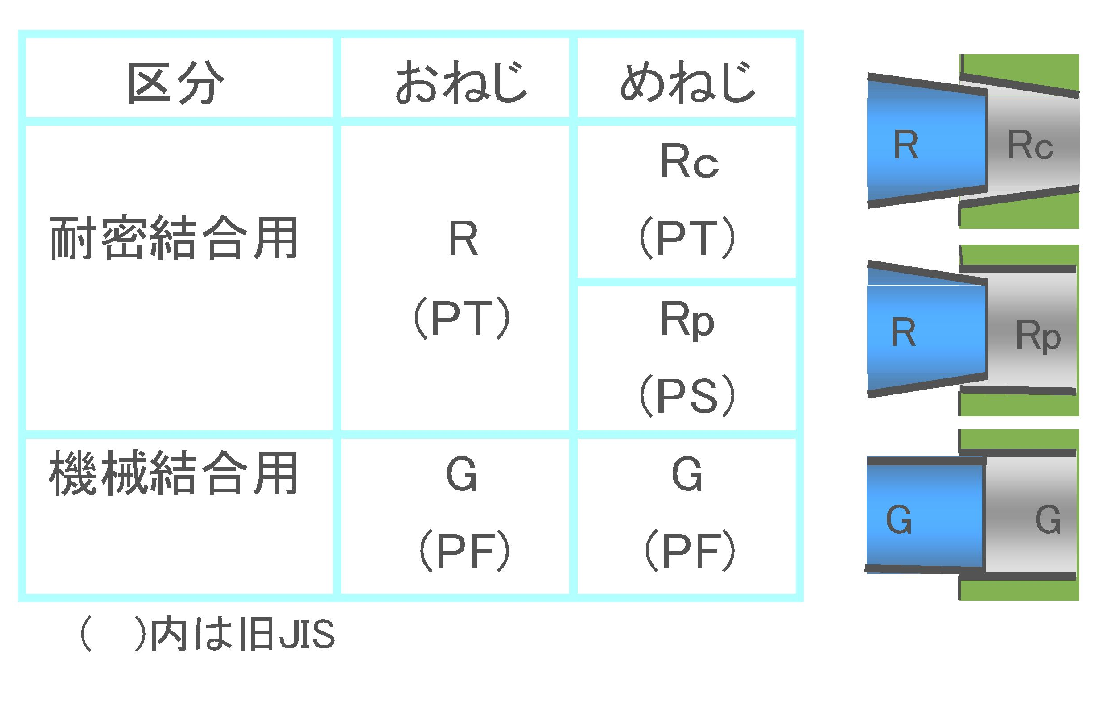ネジの種類は管用テーパーおねじ(記号R)と管用テーパーめねじ(記号Rc)および